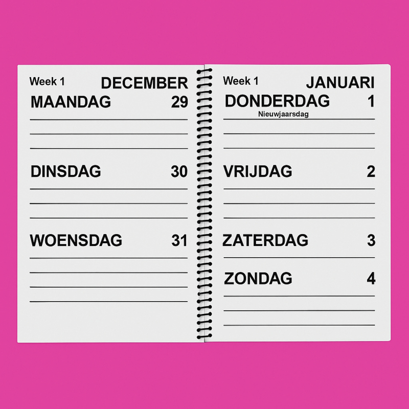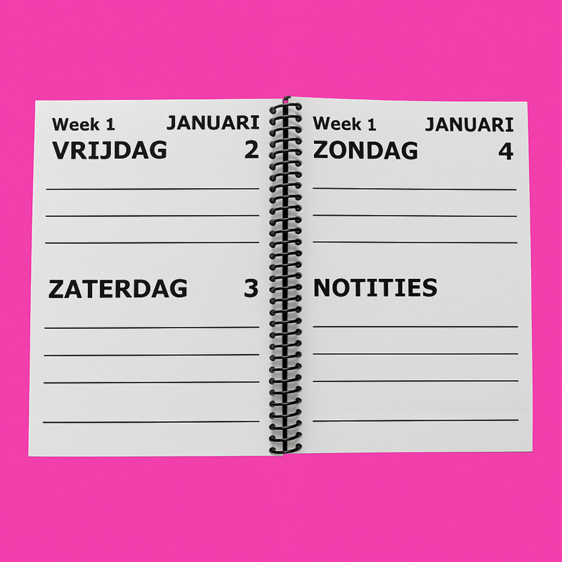 Grootletter agenda 2026 in A5 formaat met grote letters met extra grote schrijfruimte. Deze agenda is uitgevoerd met extra dik papier zodat viltstift aantekeningen niet doordrukken naar de volgende pagina.