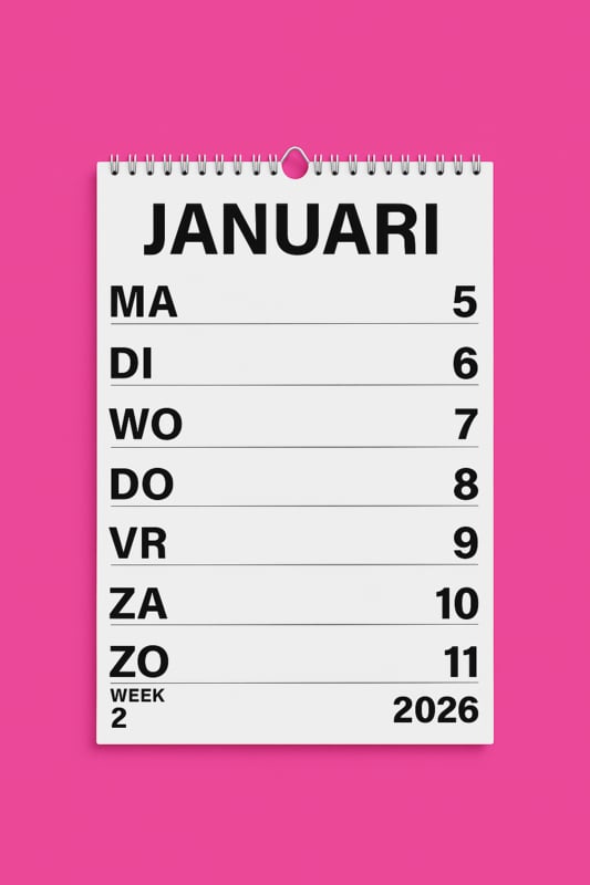 Weekkalender 2026 met grote letters en cijfers in A4 formaat. Deze weekkalender is in grootletterschrift uitgevoerd met extra grote schrijfruimte. Weekkalender met grote letters en cijfers.